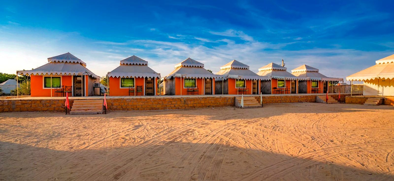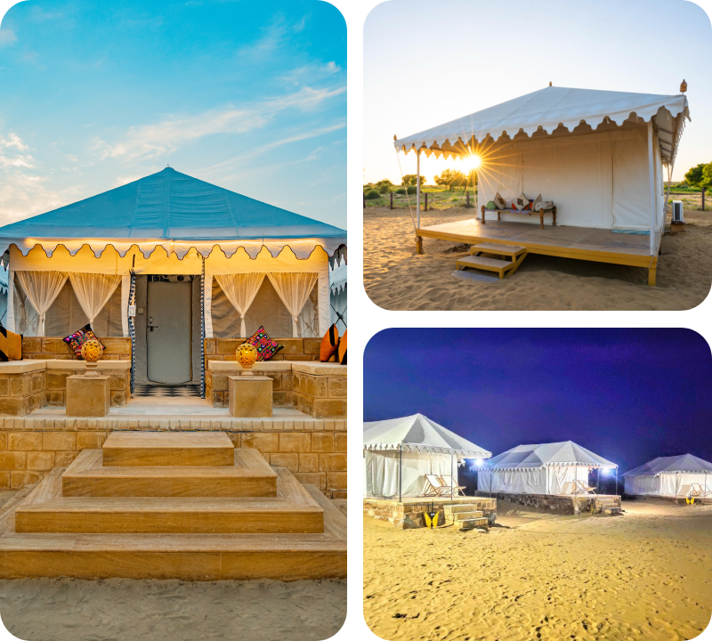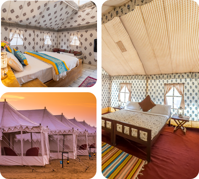 The Royal Dunes Retreat is a premium desert stay, perfect for travelers who wish to enjoy superior comfort and upgraded amenities while experiencing the magic of Jaisalmer’s desert. Guests here are welcomed with traditional hospitality and can indulge in a cultural evening filled with vibrant folk music and dance. A camel ride across the golden sands adds to the charm of the stay.